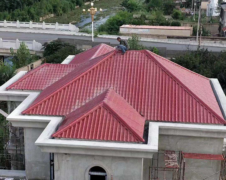 主瓦安裝時(shí)要根據(jù)當(dāng)?shù)仫L(fēng)向,逆風(fēng)安裝,搭接-個(gè)瓦波, 兩側(cè)同時(shí)進(jìn)行。安裝正脊瓦時(shí)將首張脊瓦截掉一-段后再安裝。